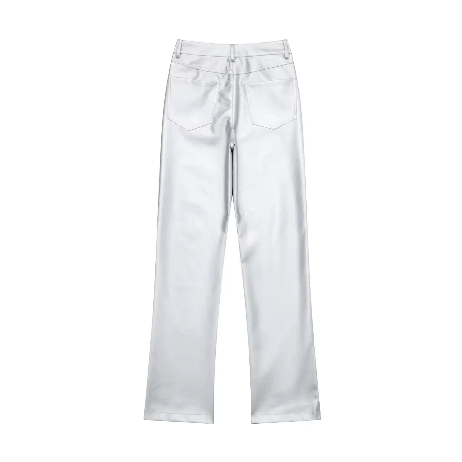 High Waist Straight Casual Wide Leg Leather Pants for Women